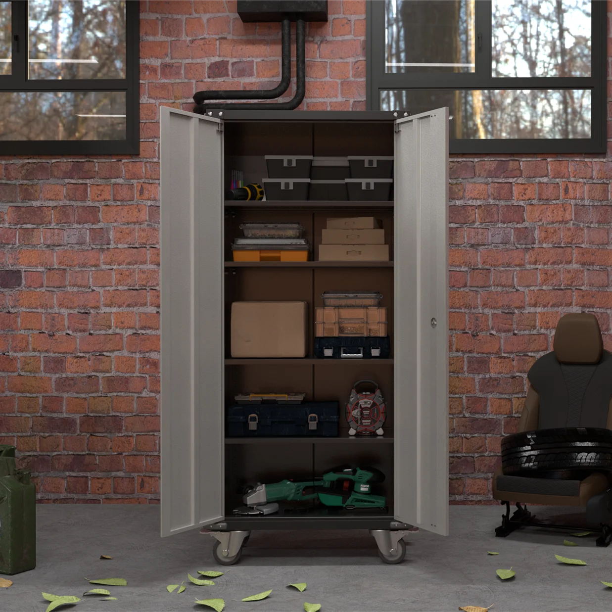 לארון אחסון לגراج עם דלתות נעולות יש 4 מדפים מתכווננים. ניתן לשנות את מיקומם כדי להתאים פריטים בגבהים שונים (למשל, תיבות כלים קטנות, קופסאות אחסון גדולות) לצורך ארגון מותאם אישית. -