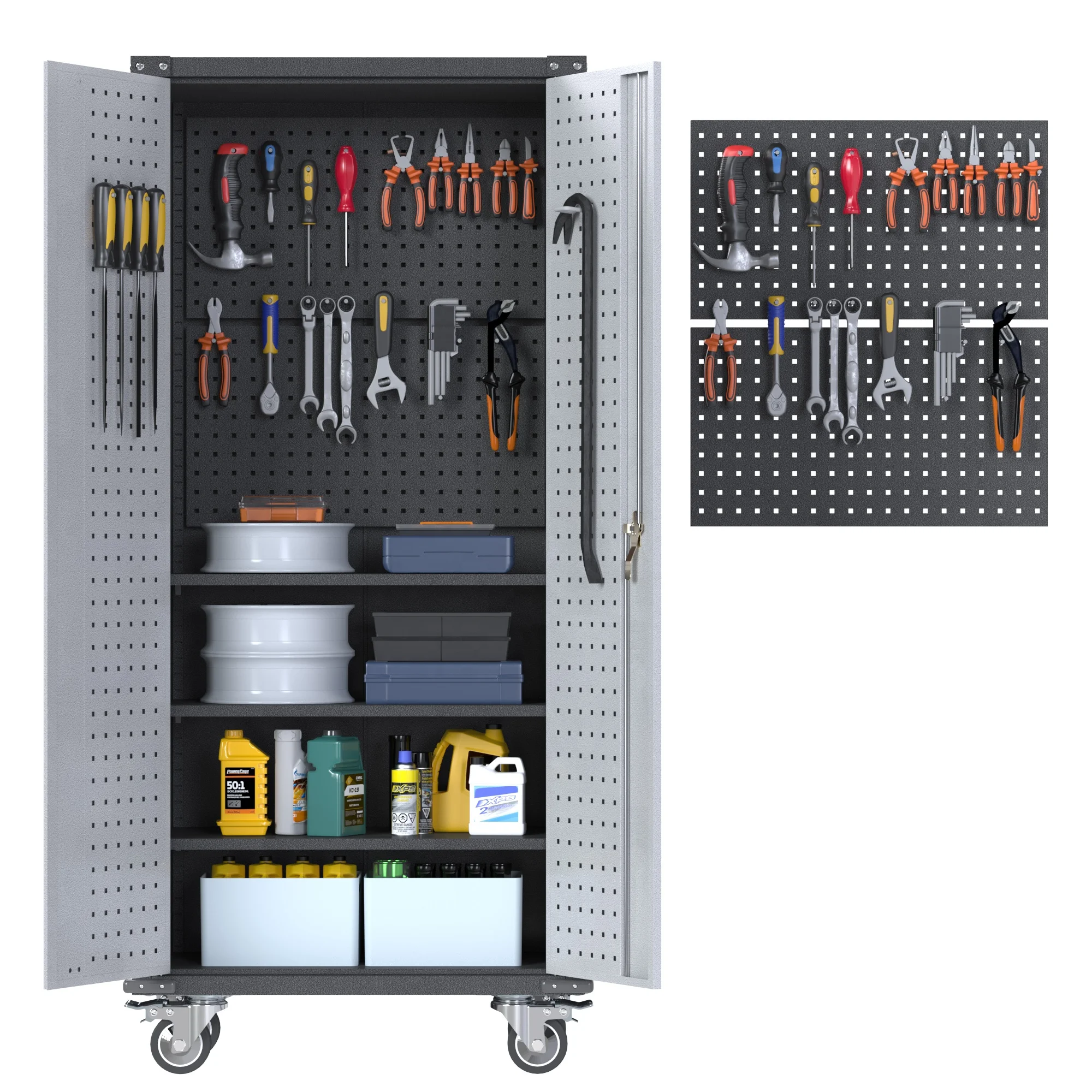 【לוח מחפרים רב-תכליתי】 לוחות המחפרים בתוך ארון הכלים המתכתי עמיד זה יכולים לשמש בשני אופנים — 1. תלו את לוח המחפרים בתוך הארון והשתמשו בסרגלים לתליית הכלים. 2. הסירו את לוח המחפרים והתלו אותו על הקיר כלוח לתליית כלים.